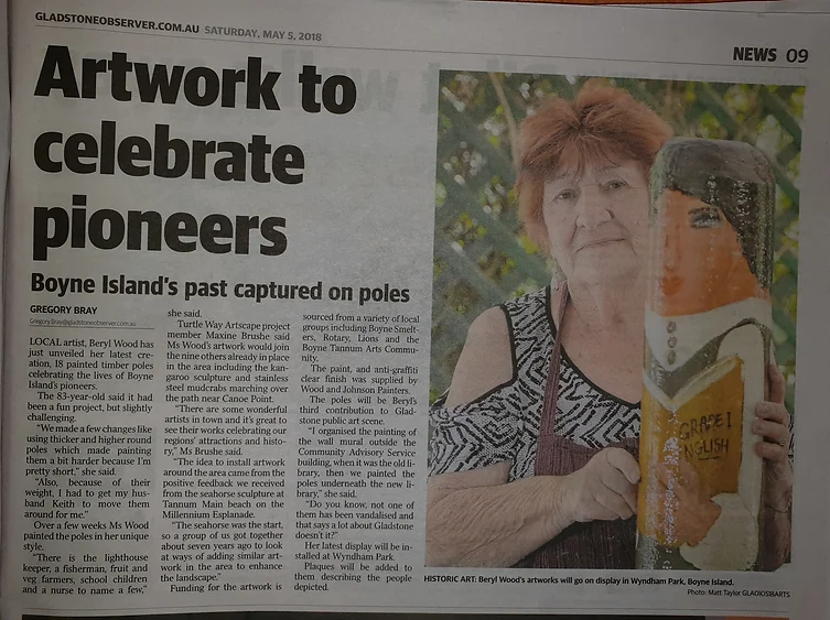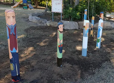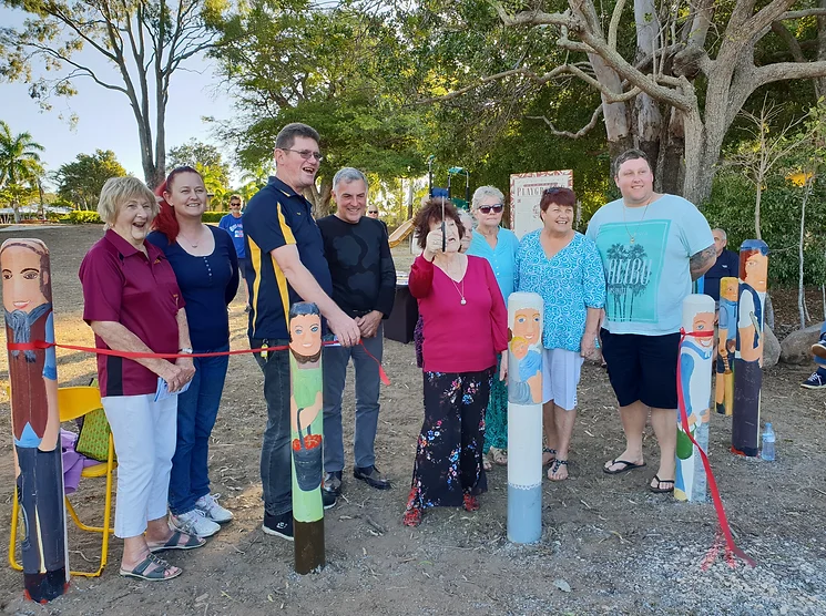 The characters on the poles are light-hearted references to the activities and occupations of the first pioneers of Boyne Island.
